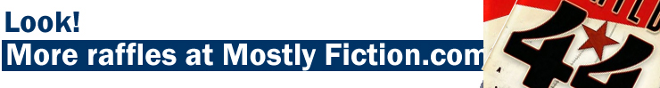 OFFICIAL RAFFLE RULESNO PURCHASE NECESSARY. VOID WHERE PROHIBITED. ELIGIBILITY: This raffle is open only to those with shipping addresses in the United States. HOW TO WIN: Winners are randomly selected from all correct entries by MostlyFiction.com within one week of the close of the raffle. Entries must be received by midnight Monday May 19, 2008. MostlyFiction.com is not responsible for entries lost or delayed or not received for any other reason, or for errors in the entry forms or the rules. MostlyFiction.com reserves the right to announce the winner on MostlyFiction.com and publish any materials submitted as part of the entry. MostlyFiction.com will own the copyright to any such material published on the Web site Winner also agrees that MostlyFiction.com can promote and publicize the winner's entry in appropriate promotion and press materials. PLEASE ENTER RAFFLE ONLY ONCE! PRIZES: MostlyFiction.com will notify the randomly selected winner. The winner will have 3 days after notification to respond for collection of the prize. NOTE: If you are a teen under 16, you must have your parent's permission before providing MostlyFiction.com with your home address information for prize delivery. HOW TO ENTER: Complete the form provided or send your name, e-mail address, address (optional) and answers to [email protected]. Previous raffle winners: |